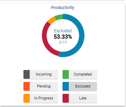 Productivity: A donut chart that displays Incoming, Pending, In Progress, Completed, Excluded and Late orders. |