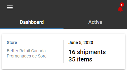 The Mobile Store Fulfillment application is divided into two main tabs: the Dashboard and an order display tab. The name of this second tab changes depending on the selected category. This tab is called Active when it displays active shipments currently handled by your store. It is called Offered when it displays shipments offered to your store as part of the Competition model.