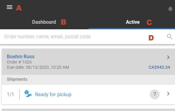 | c. | The Active tab, where you can access the orders assigned to your store. |
