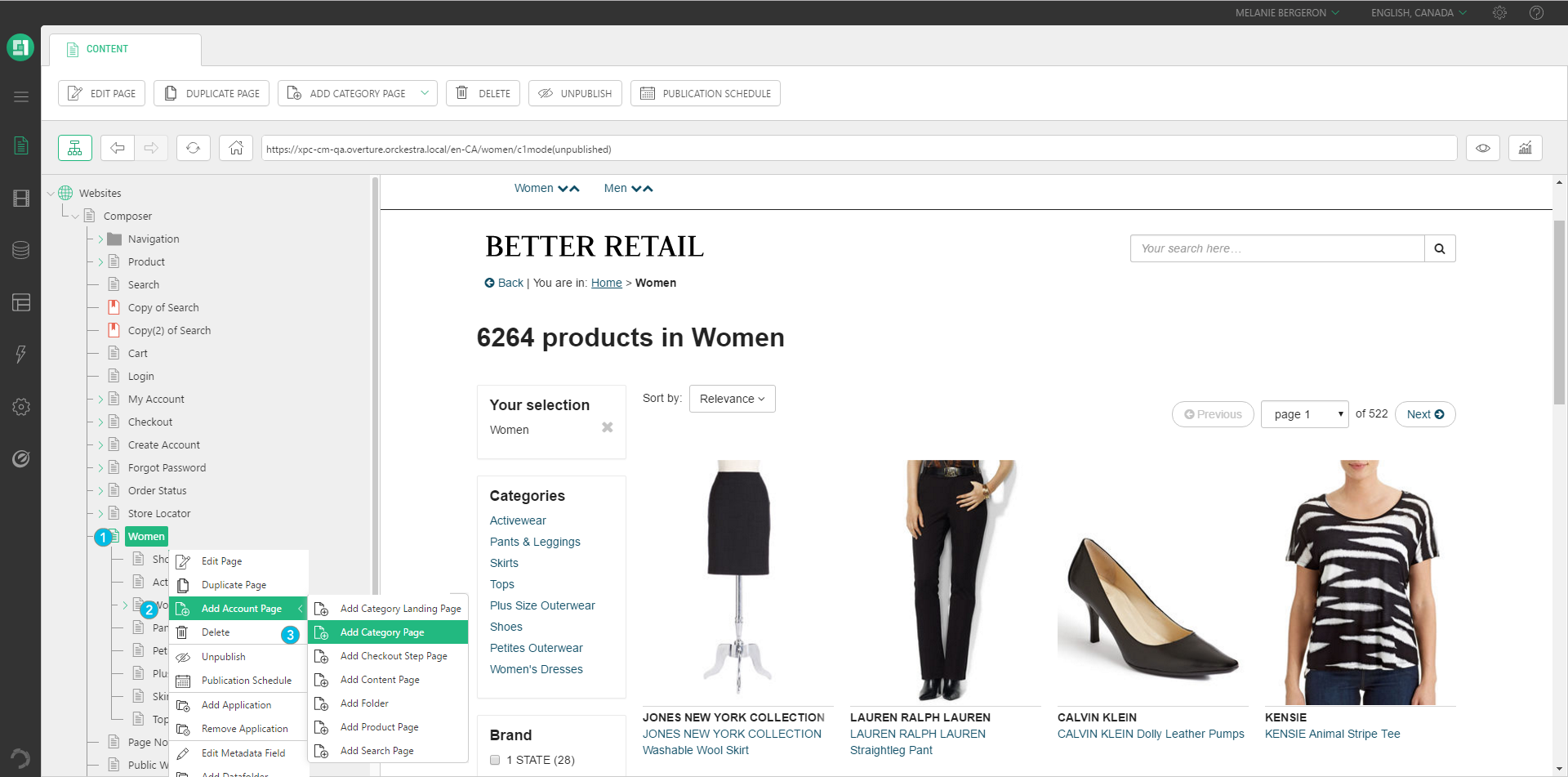 In Experience Management, you can add category pages to your website using the categories from the Product Management in Orckestra Commerce Cloud. The Add Page button includes a selector that you can use to choose a Category page or Category Landing page.