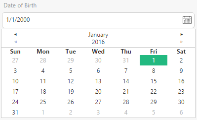 The DateSelector widget allows you to select a date as an input value. As the user clicks the widget, a month calendar drops down where the user can navigate to the specific year and a month and select a date.