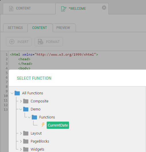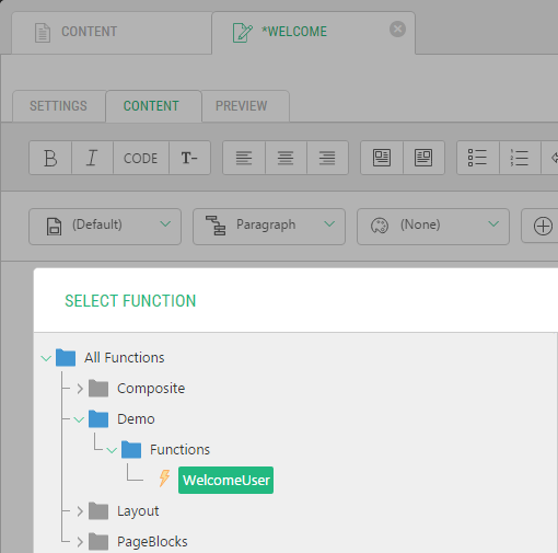 The return type of an inline or external C# function influences whether the function will be available in Visual Editor (Visual mode of the page editor) in the Select Function dialog.