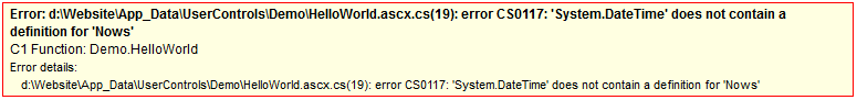 If you edit a User Control function in Visual Studio, you can always see the error information on Visual Studio's Error List panel.