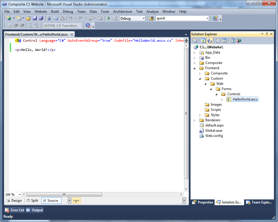 Open your website in Visual Studio (see “Hello World Page in Experience Management). |