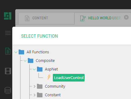 In the Select Function window, expand All Functions, Composite, and then Asp.Net and select the LoadUserControl function. |