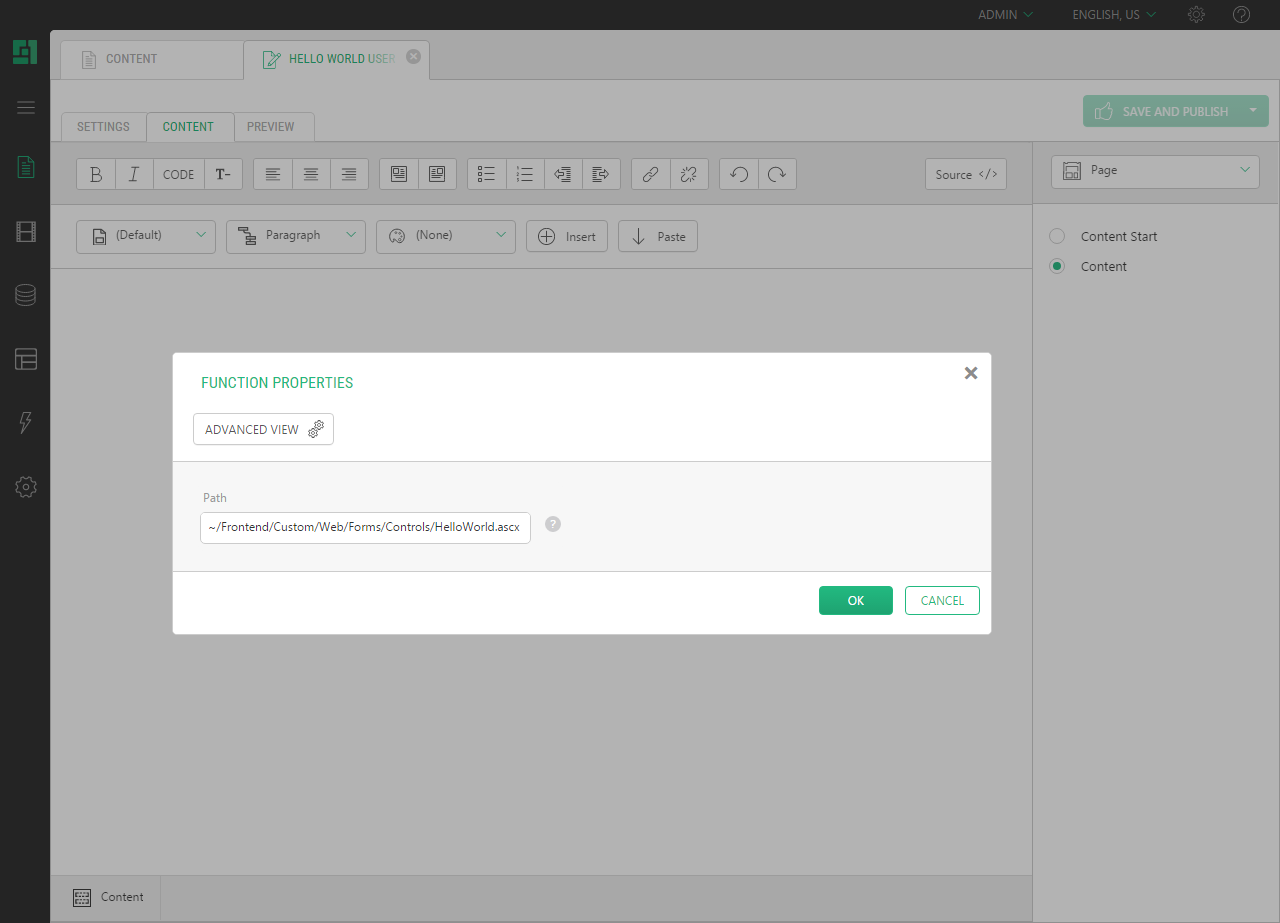 Select the Path property and enter the path to the user control on the website, e.g. ~/Frontend/Custom/Web/Forms/Controls/HelloWorld.ascx. |