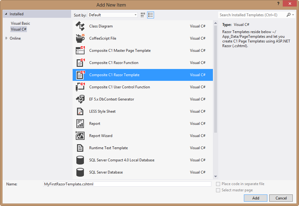 4. In the "Add New Item" window, select "C1 CMS Razor Template".