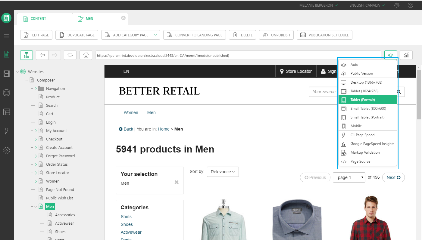 In the example below, the Better Retail website is displayed as Tablet Portrait preview mode.