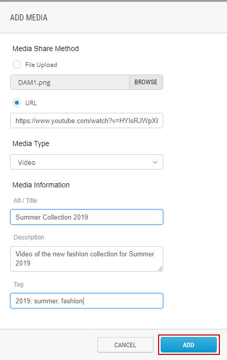 You can add media by either, browsing your computer and selecting a file or specifying a URL (like a Youtube video).