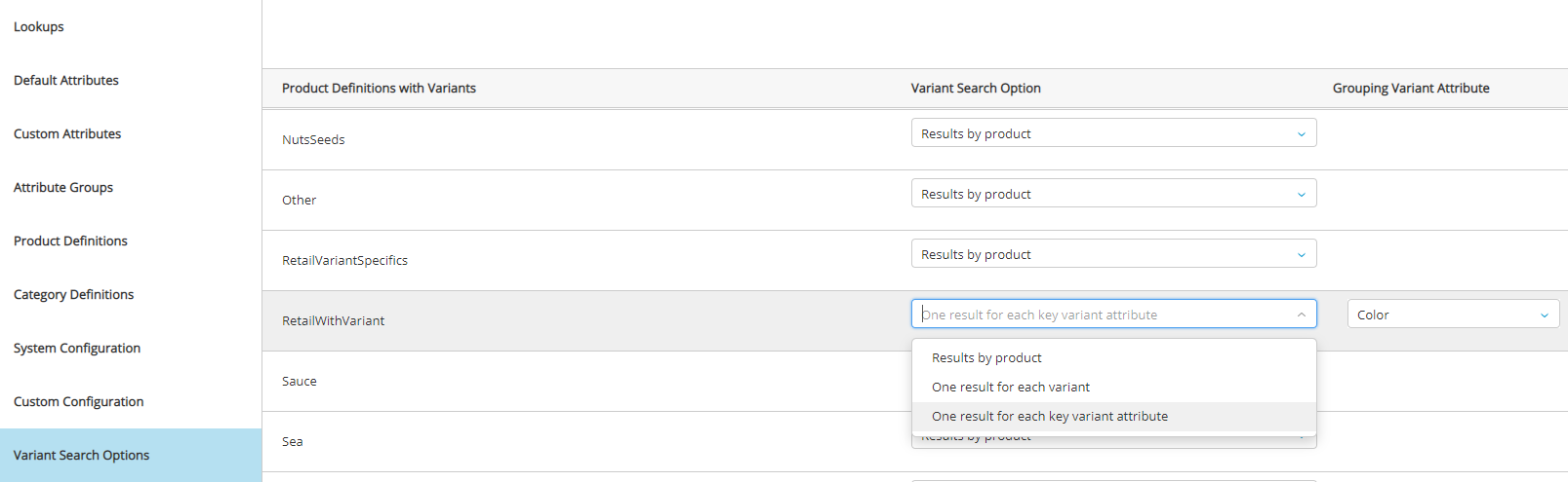 | 4. | OPTIONAL: If you selected One result for each key variant attribute value or One result for each custom attribute value, the Grouping Variant Attribute drop-down is displayed. |