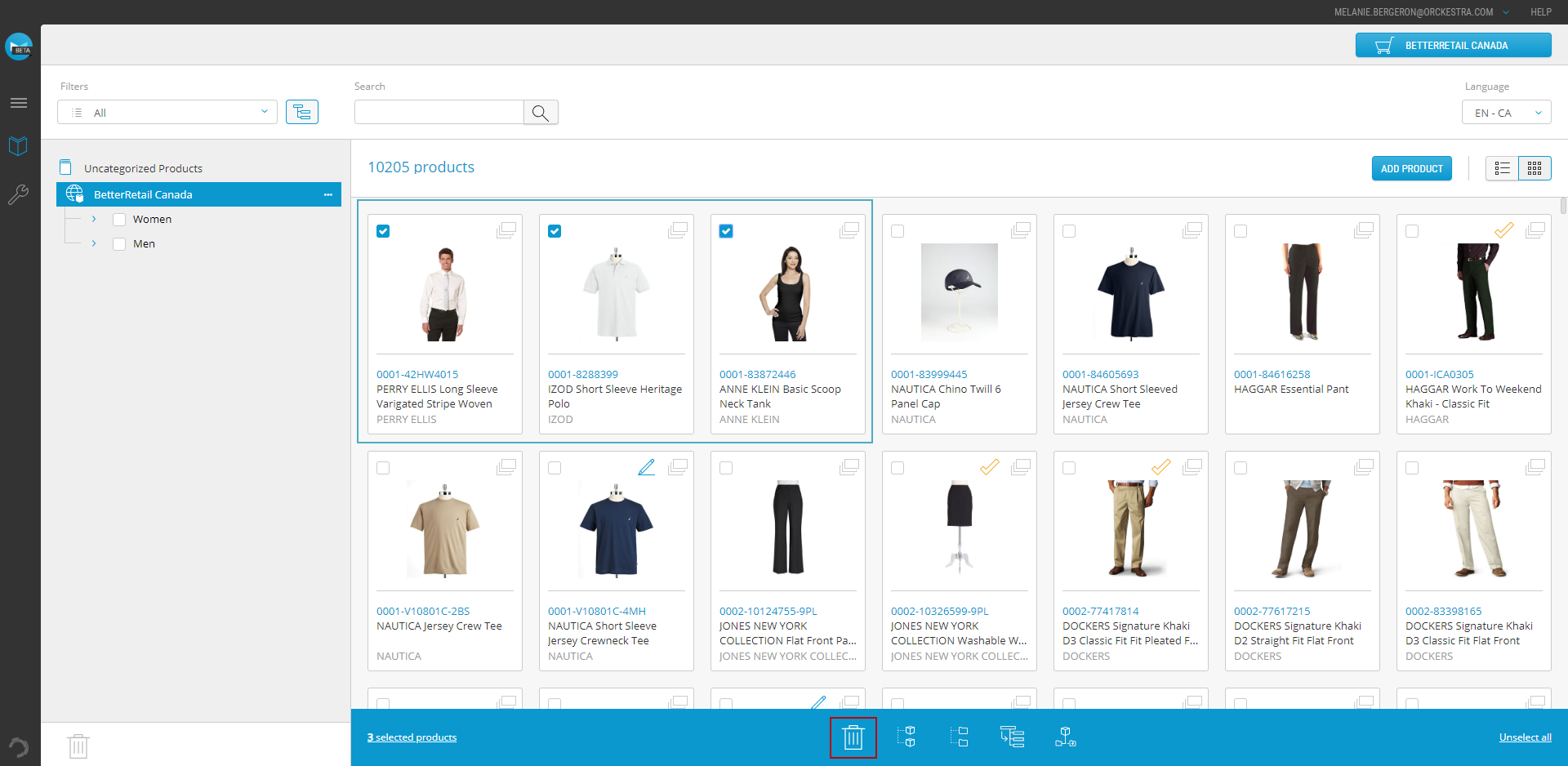 Tip: the number of products selected to delete appear at the bottom-left corner of the toolbar.