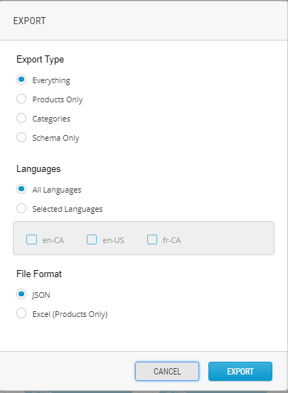 When exporting data, you can export the content of an entire catalog or target a specific category.