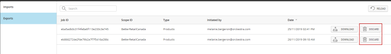 The export log activity displays all export packages generated by any user of your Orckestra Commerce Cloud platform. You can discard export packages when you downloaded them or generated them by mistake.
