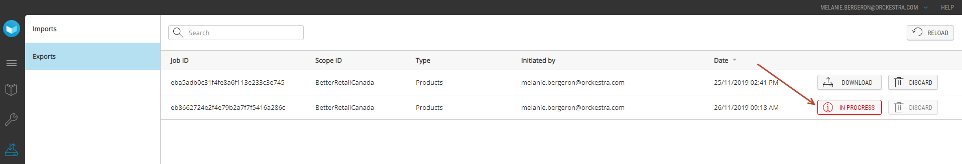 An export can run for few seconds or minutes depending on your export volume. If you access the Export module and your export is in progress, click Reload to refresh your file status.