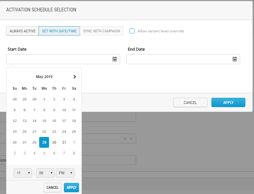 Using this option, you can specify the variant start and/or end date.