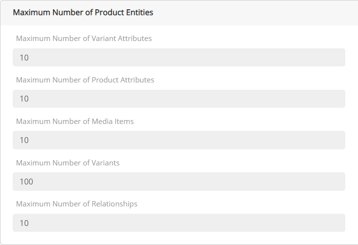 In order to manage the size and complexity of your catalog, it is possible to set maximums for the various entities that make up your products: