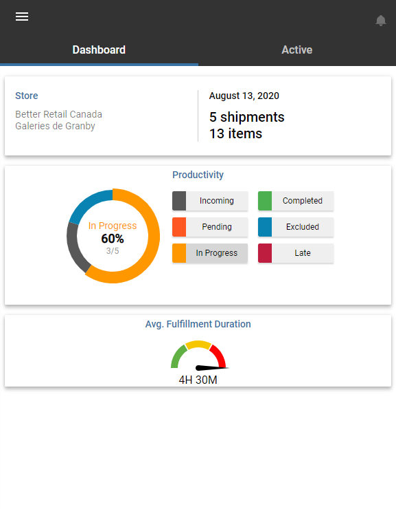 The Mobile Store Fulfillment application is divided into two main tabs: the Dashboard and an order display tab. The name of this second tab changes depending on the selected category. This tab is called Active when it displays active shipments currently handled by your store. It is called Offered when it displays shipments offered to your store as part of the Competition model.