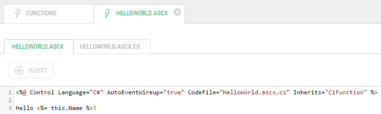 <%@ Control Language="C#" AutoEventWireup="true" CodeFile="HelloWorld.ascx.cs" Inherits="C1Function" %> Hello <%= this.Name %>!
