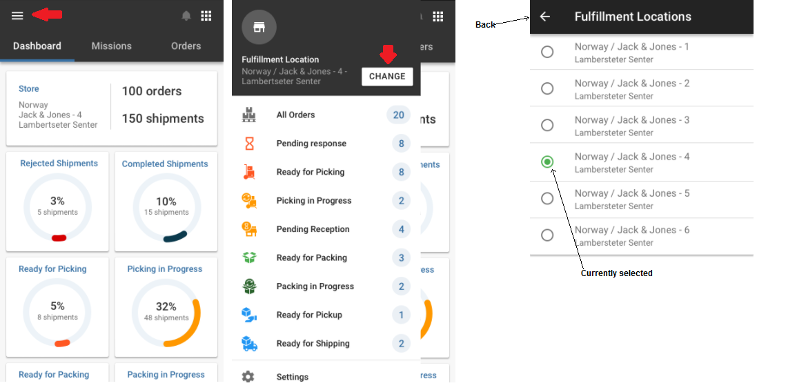 Depending on your user roles and permissions, you may have access to multiple stores in Mobile Store Fulfillment. You can switch store at any time using the hamburger menu.