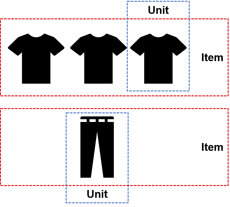An item is equivalent to a product, regardless of the number of units ordered. When splitting on items is allowed, a store must provide all of the units ordered. A unit, on the other hand, is a single instance of an item. When splitting on units is allowed, it is possible to provide only part of the units ordered.