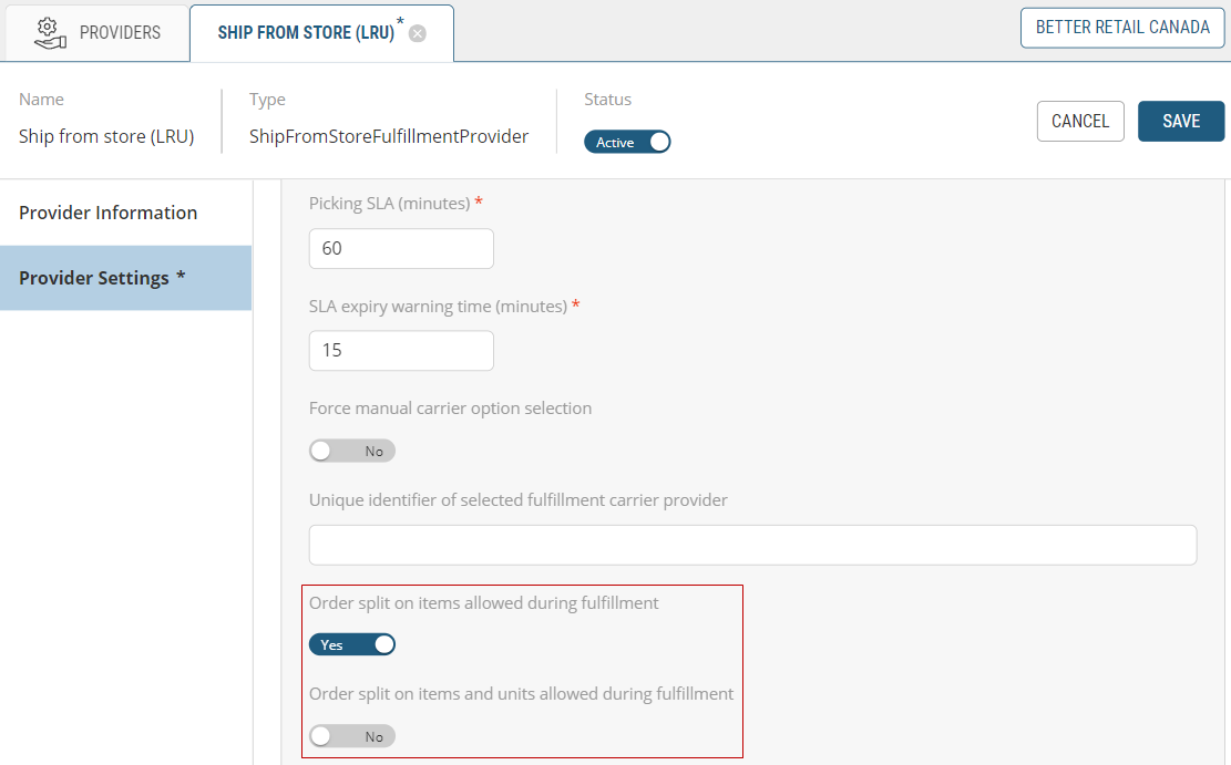 If both of these settings are showing No, shipments cannot be split and must be rejected as a whole if the fulfillment center cannot fulfill them entirely. |